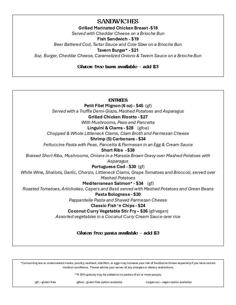 The Tavern Hours Of Operation (kitchen closes 1 hour prior)